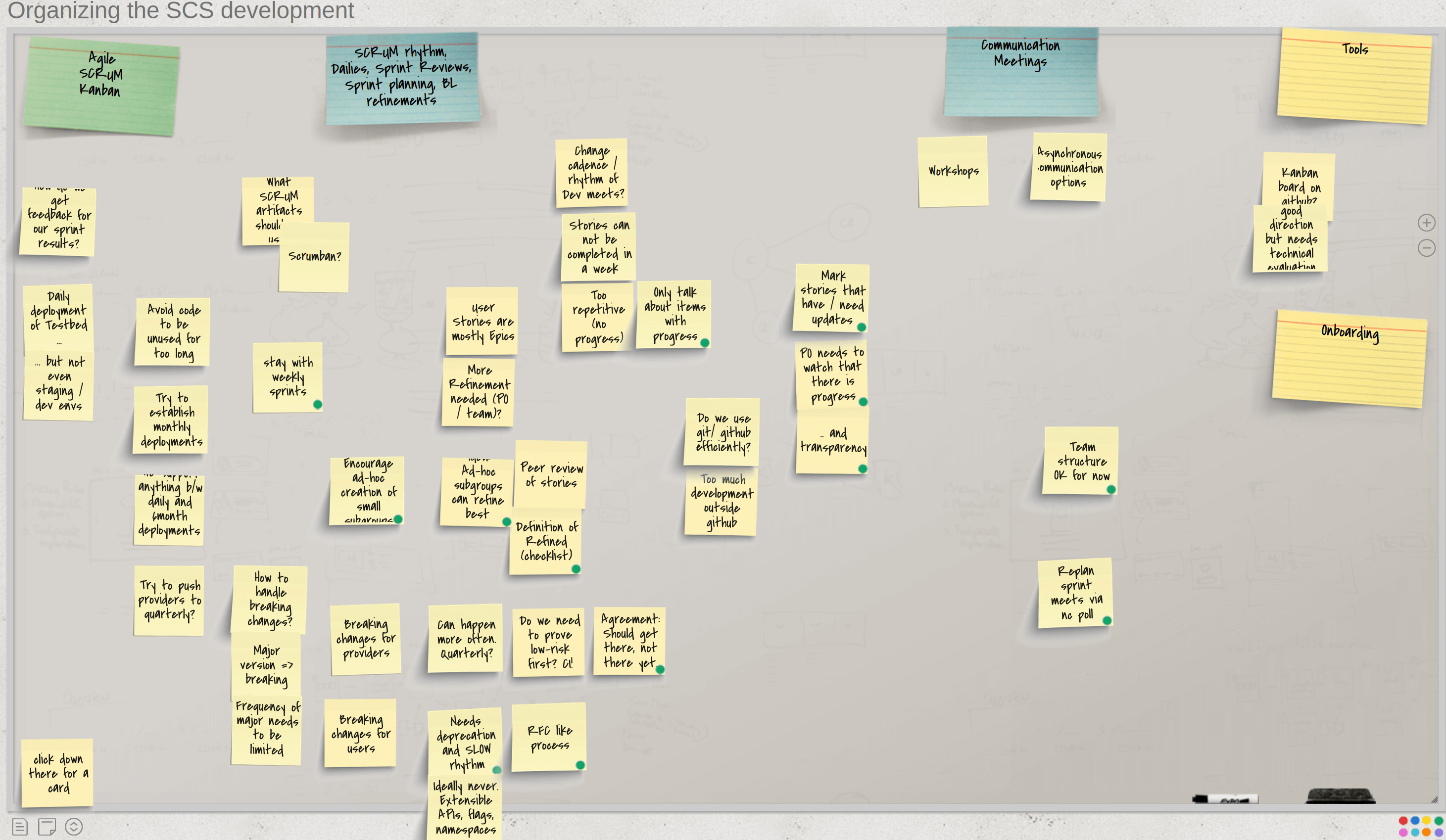 In the group working phase, the organization of our development work was the most frequent out of originally four topics. The results of an intensive two-hour discussion were again recorded in a Scrumblr board.