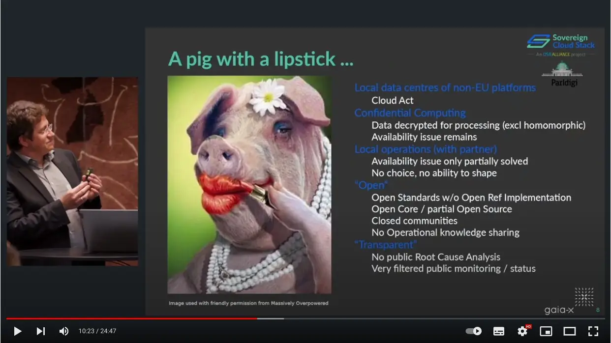 Der ganze Vortrag findet sich mittlerweile auf YouTube und bietet einen guten Einstieg in die Motivation und die Ziele hinter Sovereign Cloud Stack. Die anschließende Diskussionsrunde hat eines gezeigt: Der Bedarf an einer souveränen Cloud ist hoch und dass es mehr Bedarf als reine “Datenhoheit” und Compliance.