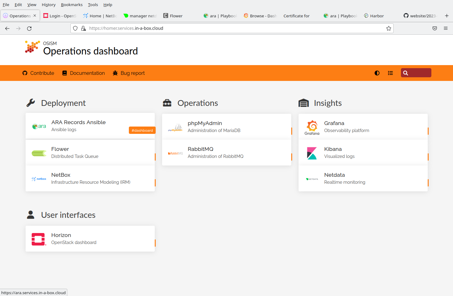 There are a number of web interfaces available for exploration of your cloud; they are listed in the documentation of the cloud-in-a-box on the OSISM repo on github. If you just want to bookmark one page, you should use the Homer dashboard which has links to all the other web interfaces.