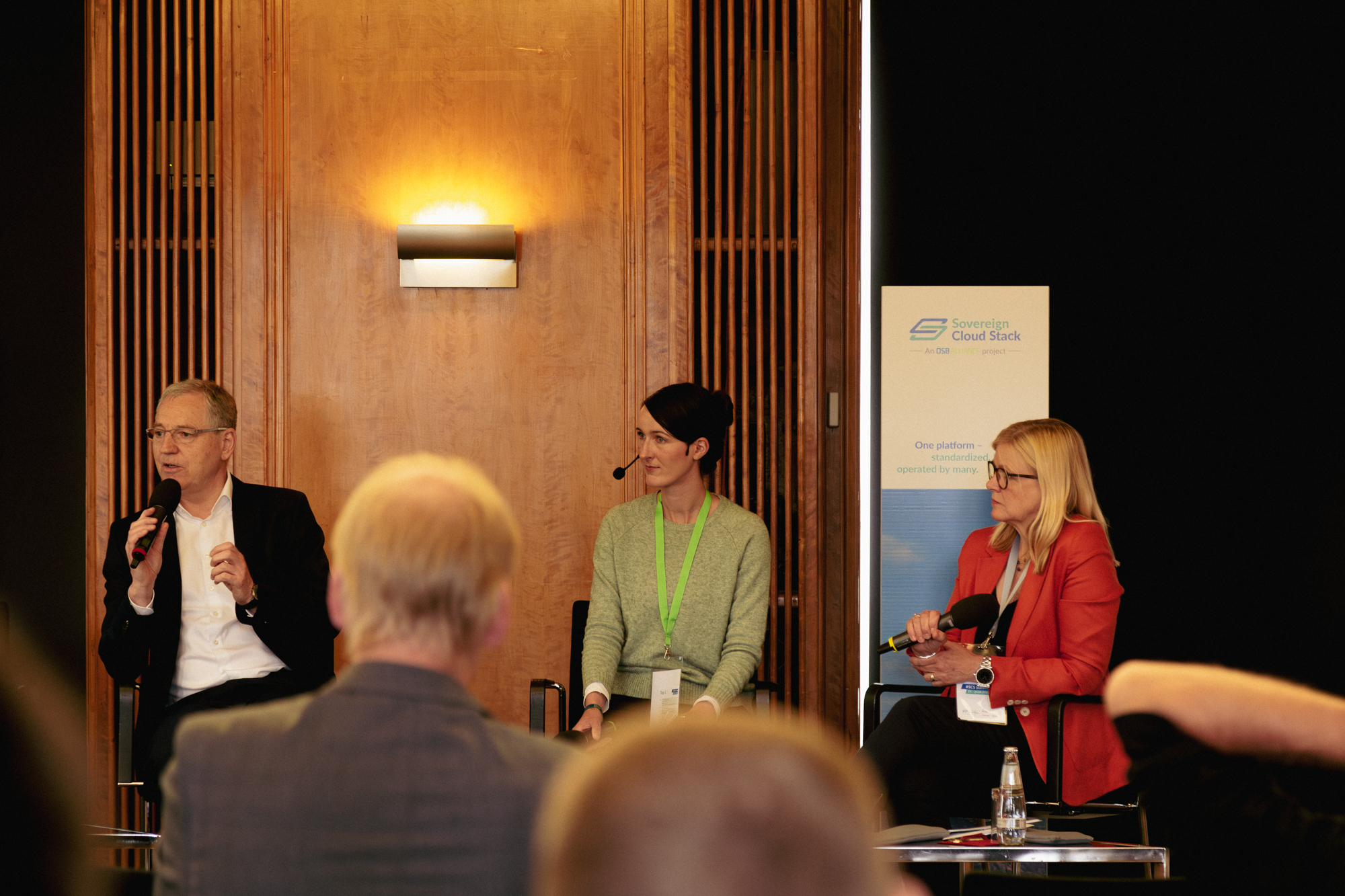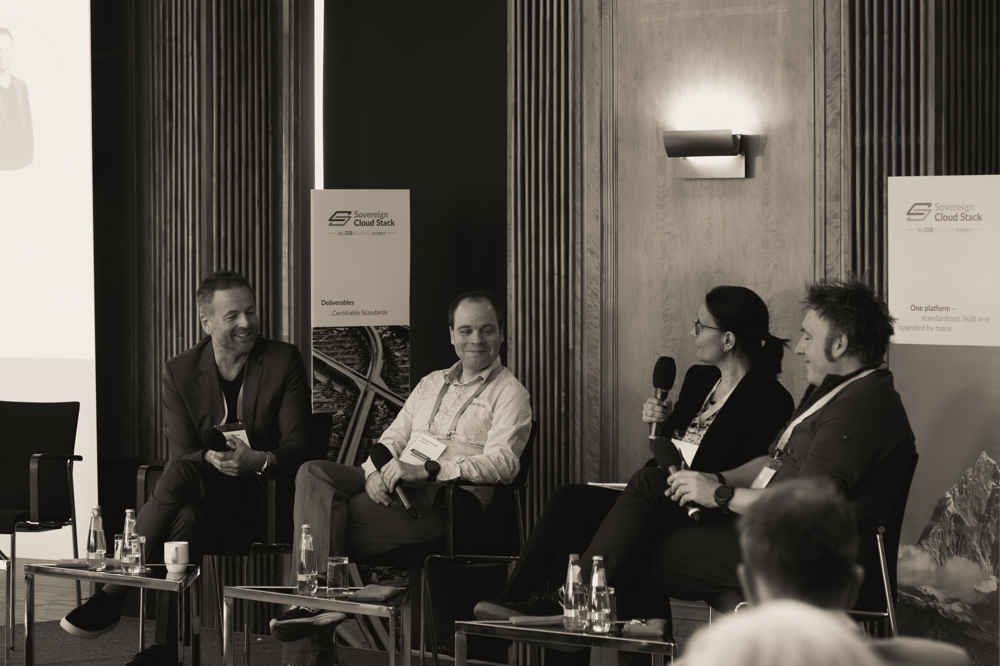 — Friederike Zelke, Community Manager SCS, OSB Alliance e.V. (Moderation); Alexander Wallner, CEO plusserver GmbH; Cemil Degirmenci, Geschäftsführer der Wavecon GmbH (100% noris network AG); Felix Kronlage-Dammers, Product Owner IaaS & OPS SCS, OSB Alliance e.V.; Christian Berendt, Founder und CEO der OSISM GmbH