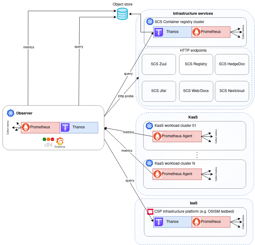 We’re excited to announce that our Minimum Viable Product (MVP) for extending the monitoring from the IaaS layer to a solution that covers observability and monitoring full-stack has achieved a presentable and viable state. MVP aims to provide a global monitoring view of various SCS layers and components, including KaaS, IaaS, and actively used services within the SCS community such as Jitsi, HedgeDoc, Nextcloud, Harbor container registry, and more. The global view is made possible by the Observer monitoring solution we’ve designed. The Observer enables the collection, storage, and visualization of metrics from the SCS infrastructure.